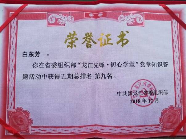 此次答题活动从10月22日开始,11月23日结束,共5周时间。每期答题的最终成绩,以所有答题次数中分数最高的成绩为准,分数相同情况下以用时最短的一次为准。我院经济系16级2班学生,预备党员白东芳在全省参赛的74.25万人中脱颖而出,总成绩排名第9,最终获得黑龙江省“十佳选手”荣誉称号。