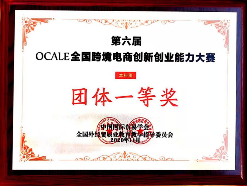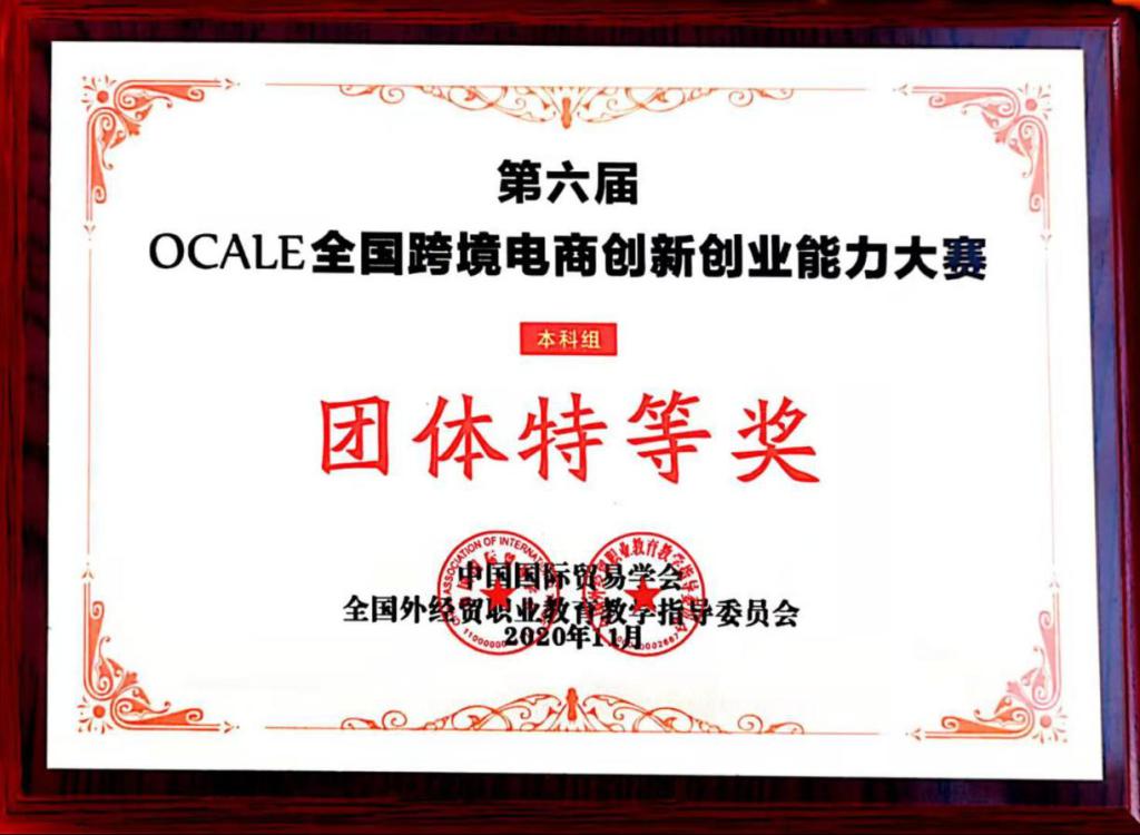 11月4日由全国外经贸职业教育教学指导委员会和中国国际贸易学会共同举办的第六届OCALE全国跨境电商创新创业能力大赛圆满落幕。新葡萄官网新葡萄8883官网AMG官网国际经济与贸易专业学生组成六支代表队,在籍丹宁和刘黎明老师的指导下,从全国108所本科高校342支队伍中脱颖而出,最终由陈虹、沈茂菊、韩冬冬、欧冰冰、宋欣、张文佳、张世泽、王春月、叔馨悦、赵开旗、辛璞、沈松松等学生组成的四支队伍获得团体特等奖;杨顺、王烨菲、周红宇、白梦蝶、金国栋、苏媛等学生组成的两支队伍获得团体一等奖。