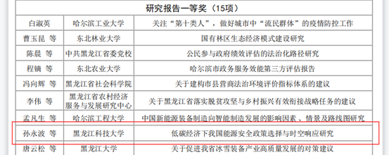 近日,黑龙江省社会科学优秀成果评奖委员会办公室公布了第二十届社会科学优秀成果奖获奖名单。本次评奖评选从2022年10月份启动,经各阶段评审,共评选出548项优秀成果,其中,一等奖50项,二等奖80项,三等奖195项,佳作奖223项。我院孙永波教授带领团队针对低碳及能源安全问题进行研究,获研究报告一等奖。这是学院创建以来首次获得省级科研一等奖奖励。