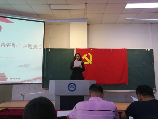 活动在嘹亮的国歌中开始,首先由毕业生党员代表杨琳琳、刘杨柏红和赵阳分别带领大家重温了入党志愿书、入党谈话和入党誓词。接着,张书记以 “给年轻灵魂注入红色基因 ——以青春之我肩负起国家民族的希望”为主题进行了党课讲授,张书记以自身入党经历为切入点,从爱国、励志、求真、力行四个方面对全体党员提出了四点希望:一是要忠于祖国,忠于人民;二是要立鸿鹄志,做奋斗者;三是要求真学问,练真本领;四是要知行合一,做实干家。不忘初心、牢记使命,牢固树立“四个意识”、坚定“四个自信”,充分发挥党员的先锋模范作用。